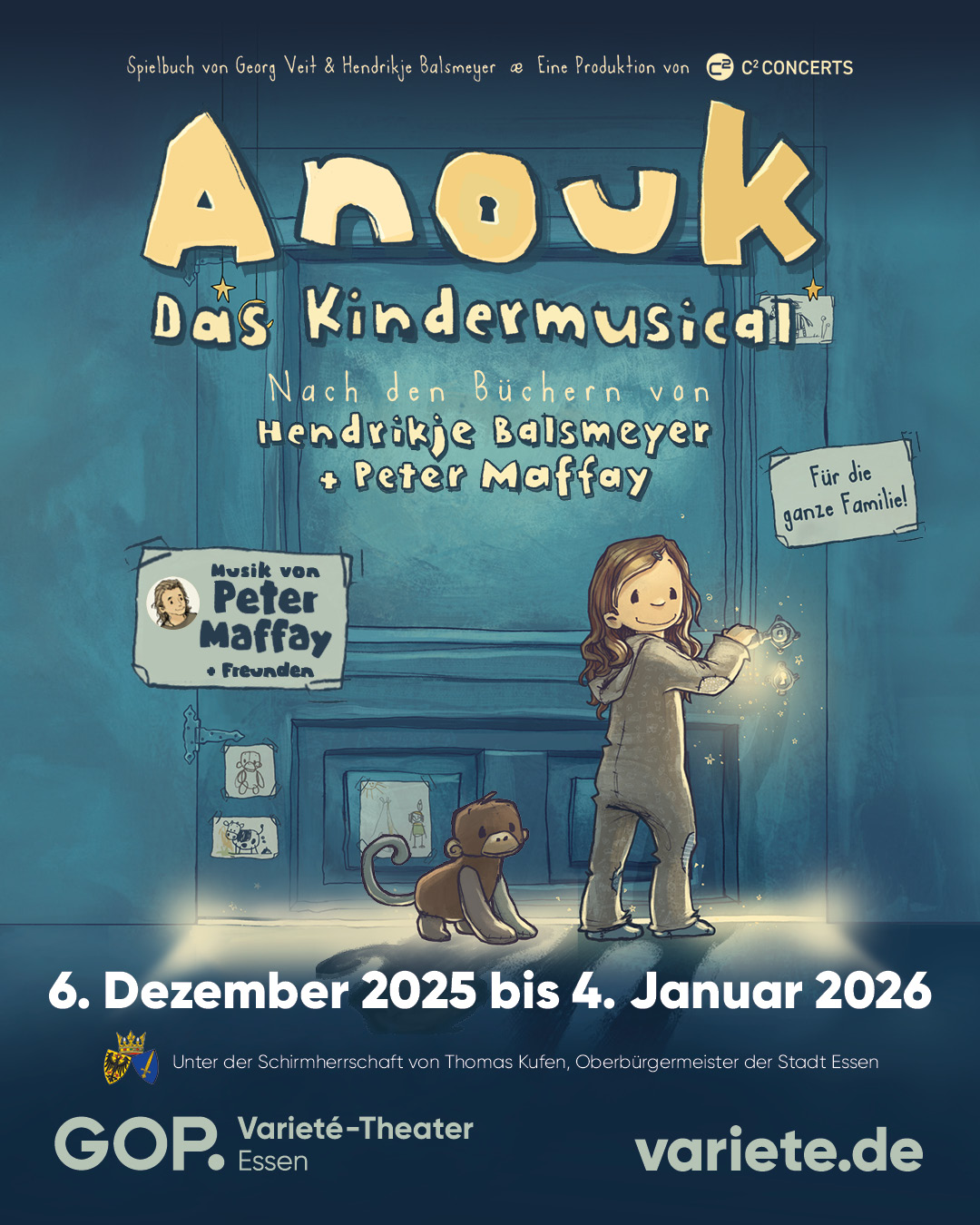 Essen. Das gefeierte Kindermusical ANOUK nach den Kinderbuch-Bestsellern von Hendrikje Balsmeyer und Peter Maffay kommt Ende des Jahres nach Essen. Nach einem fulminanten Premierengastspiel im GOP Varieté-Theater Hannover mit über 20.000 begeisterten Besucher*innen war ANOUK auf großer Tournee durch Deutschland, Österreich, die Schweiz und Norditalien. Im Dezember 2025 kommt das Musical als Ensuite-Produktion ins GOP Varieté-Theater Essen und lädt Familien und Schulklassen zu einem besonderen Theatererlebnis ein. Die Schirmherrschaft für die Essener Spielzeit übernimmt Oberbürgermeister Thomas Kufen. Präsentiert wird das Musical von “CHECKY!” – die Kinderzeitung der Funke Mediengruppe. Eine fantasievolle Welt voller Abenteuer! ANOUK entführt große und kleine Entdecker in eine fantasievolle Welt voller Abenteuer, in der alles möglich…